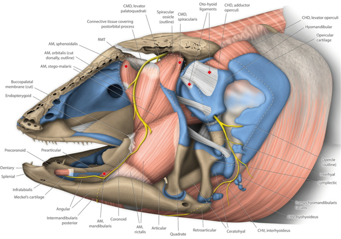 그림 1. 아프리카 실러캔스(L. chalumnae)의 두개 근골격계와 관련 뇌신경의 운동 가지들. <From Datovo and Johnson, Science Advances, 2025>