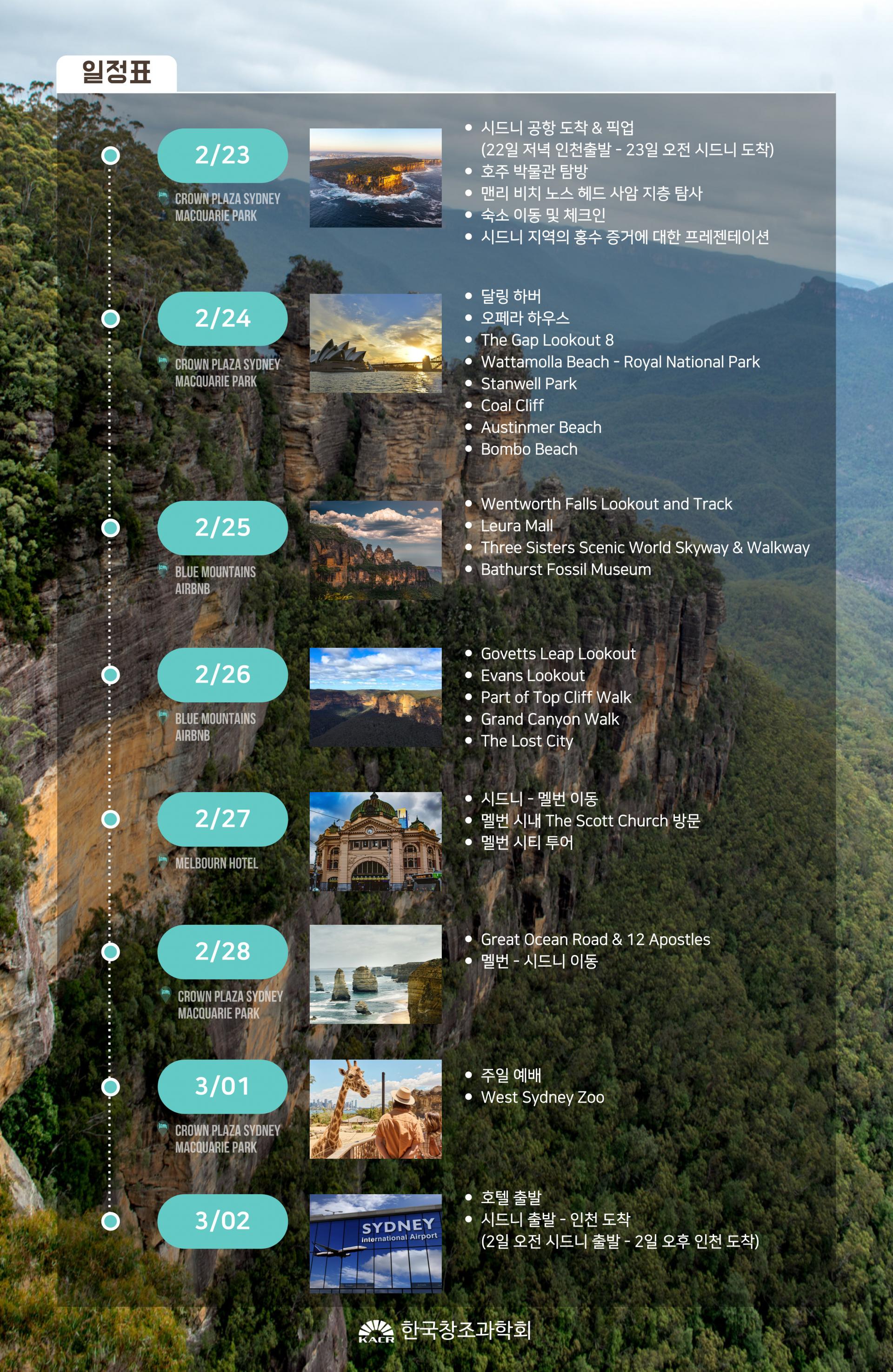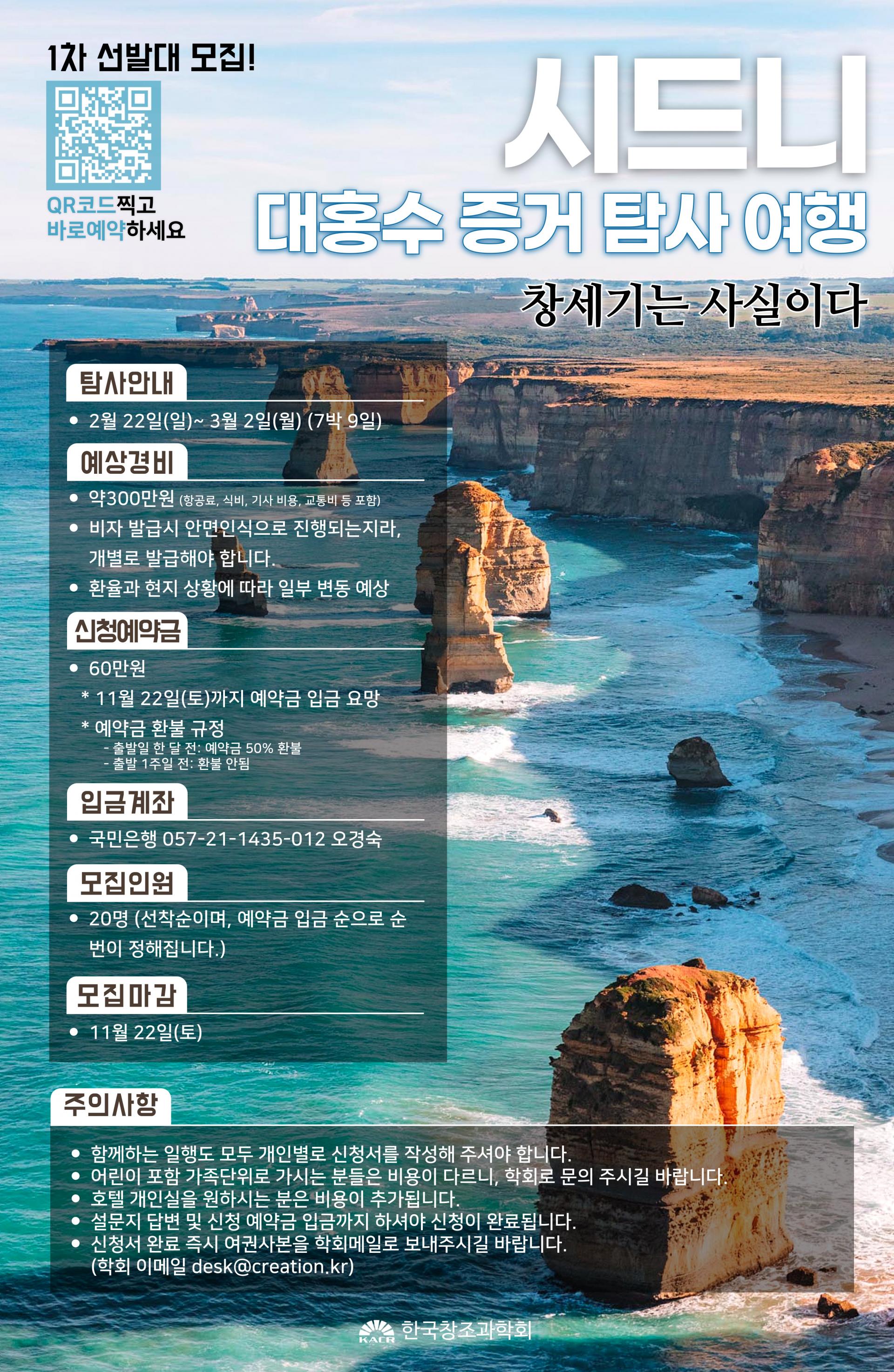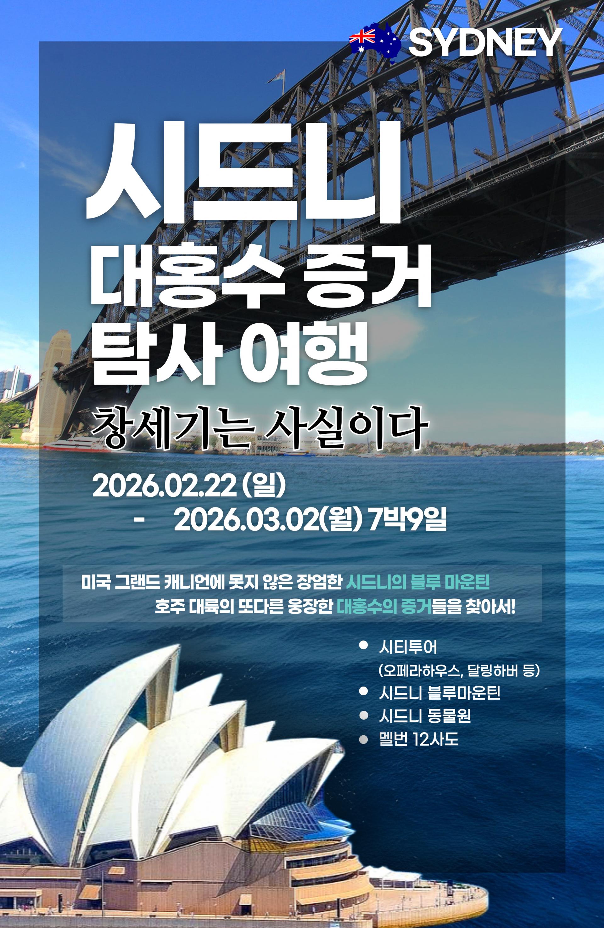 샬롬,주의 이름으로 문안 드립니다.2026년 2월 마지막 주 (2월 22일~3월 2일)성경속 대홍수 증거의 보물 같은 장소 호주,그 곳으로 탐사를 가고자합니다.아래 상세 일정 및 홍보영상을 참고하시고,대홍수의 흔적을 두 눈으로 보고 경함할 수 있는 탐사에 많은 참여 부탁드립니다.감사합니다.<탐사 안내>